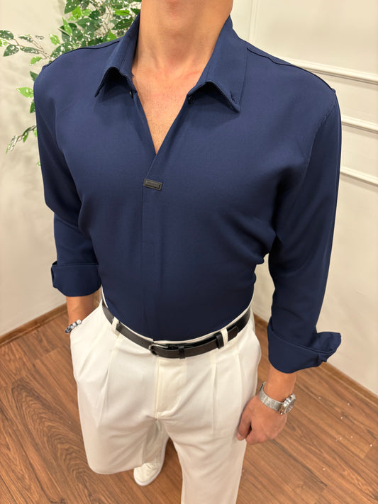 V YAKA DABIL KUMAŞ GÖMLEK LACİVERT