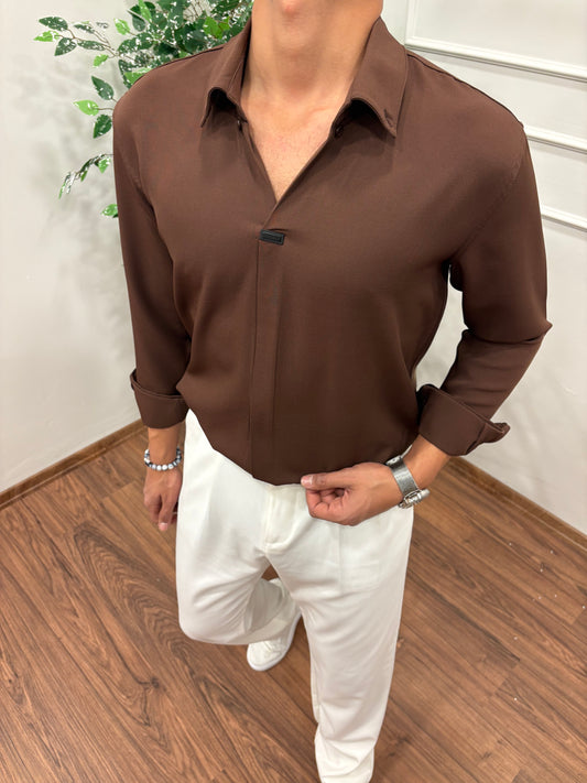V YAKA DABIL KUMAŞ GÖMLEK KAHVE