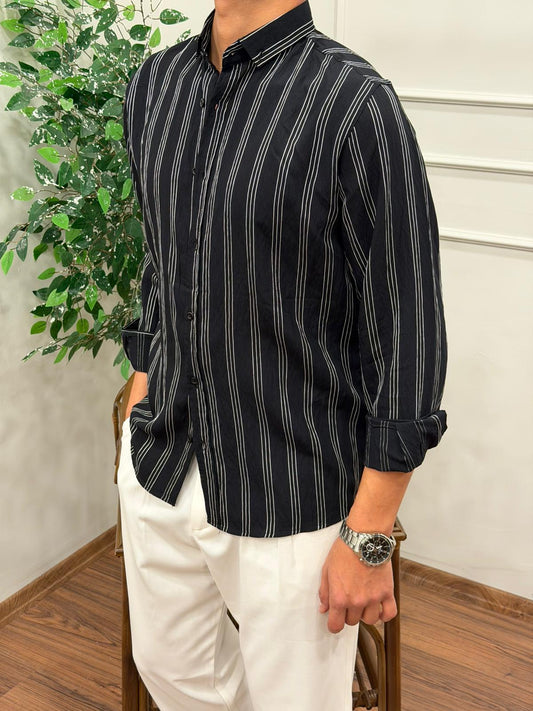 TENSEL KUMAŞ ÇİZGİLİ GÖMLEK SİYAH