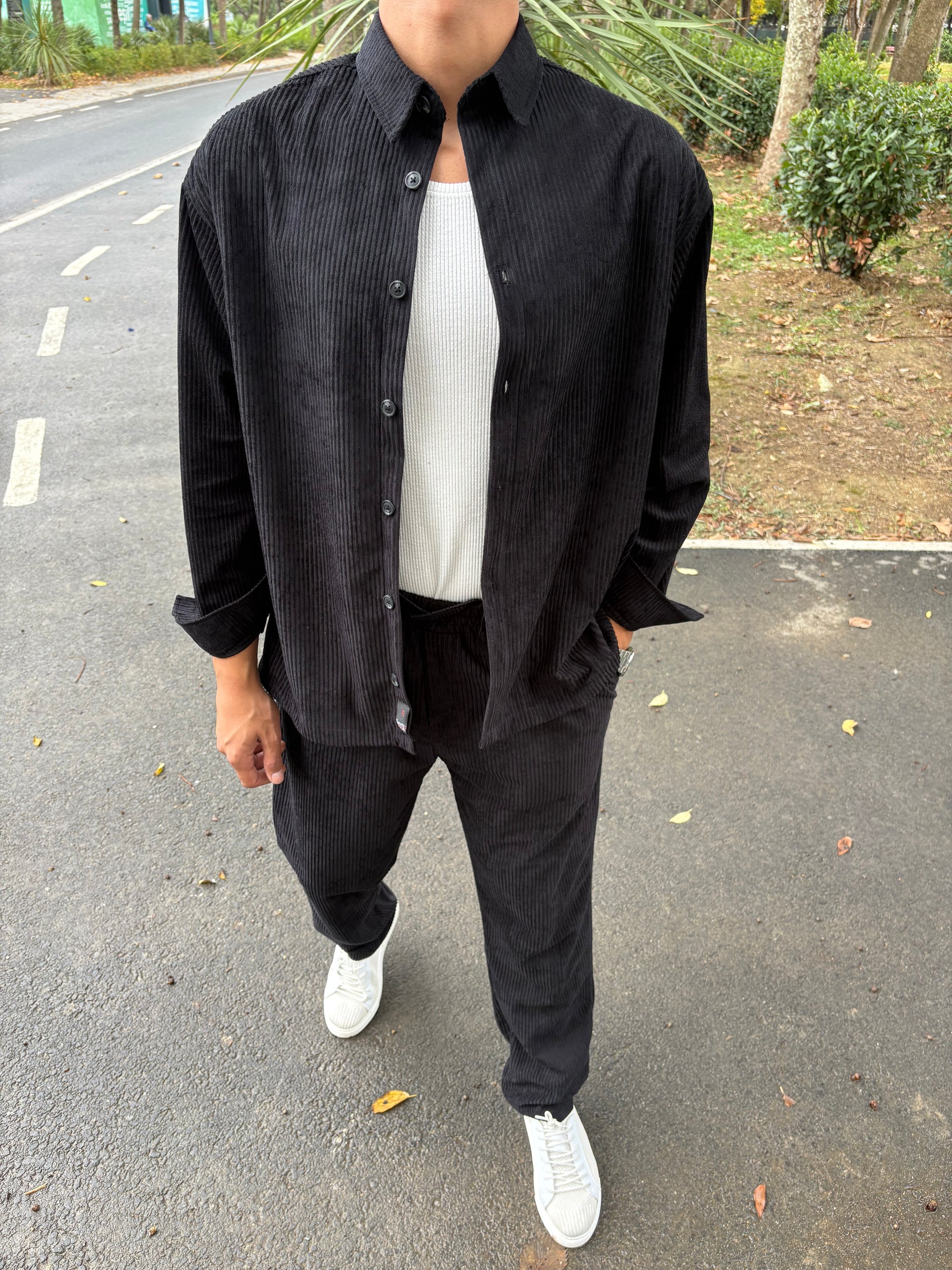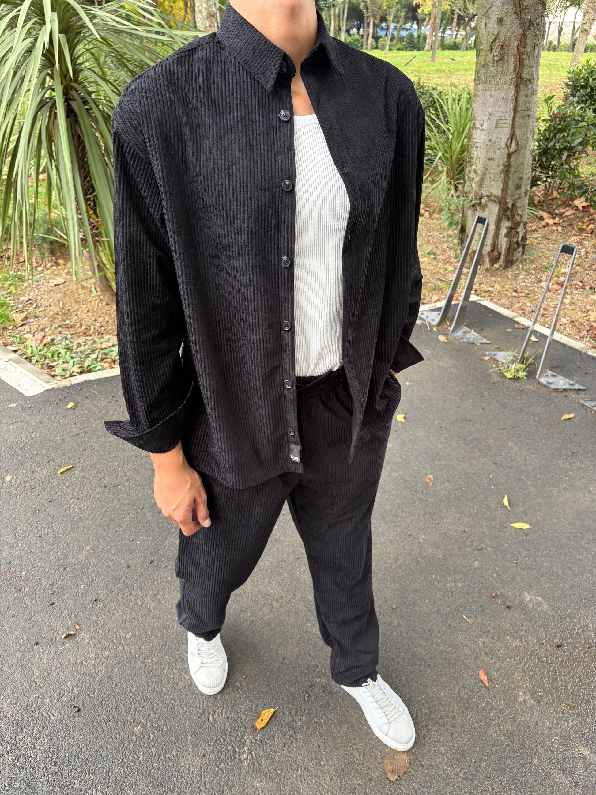 BAGGY KALIP GÖMLEKLİ KADİFE TAKIM SİYAH