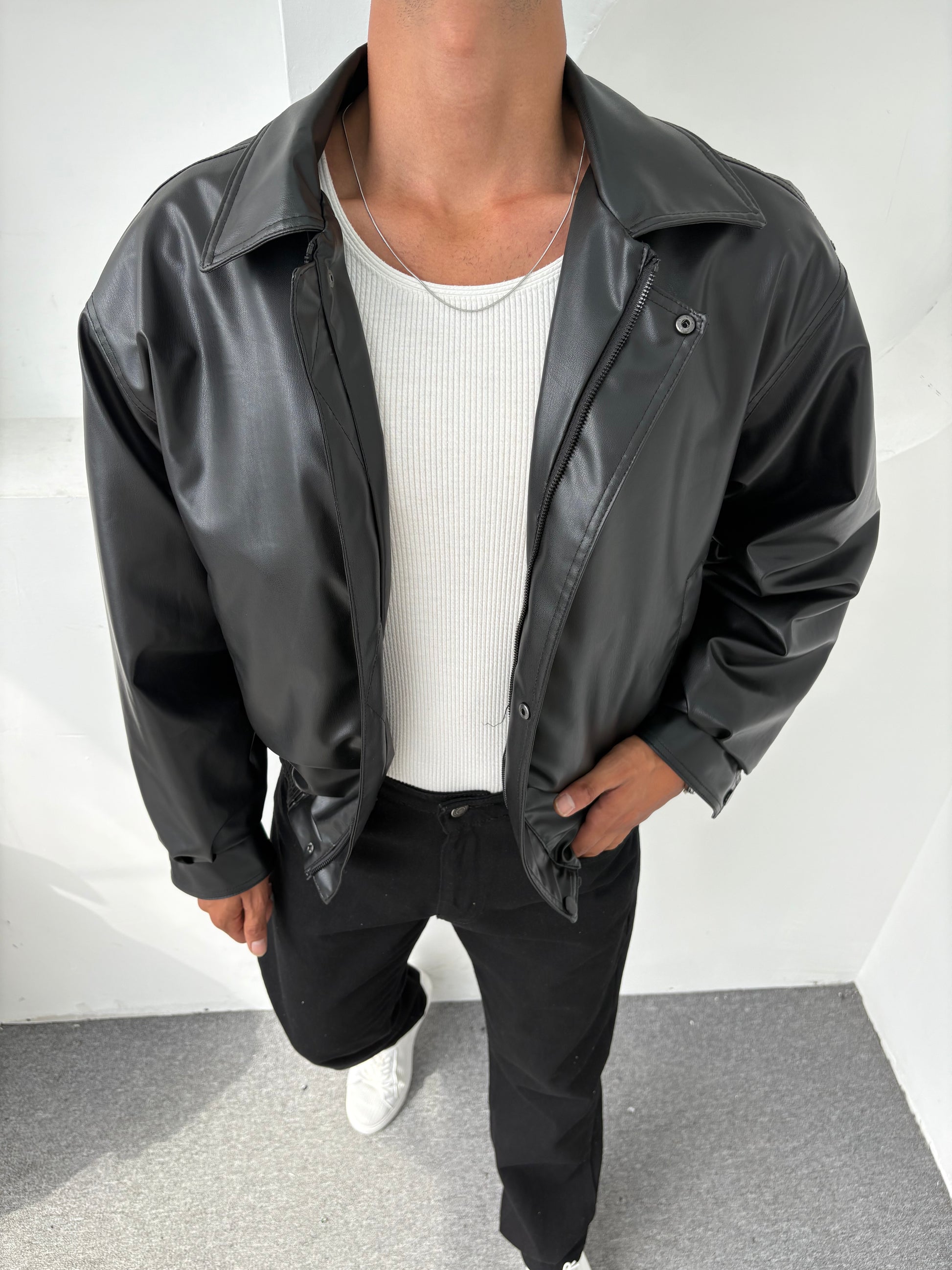 Tarzın merkezinde minimal deri ceket.