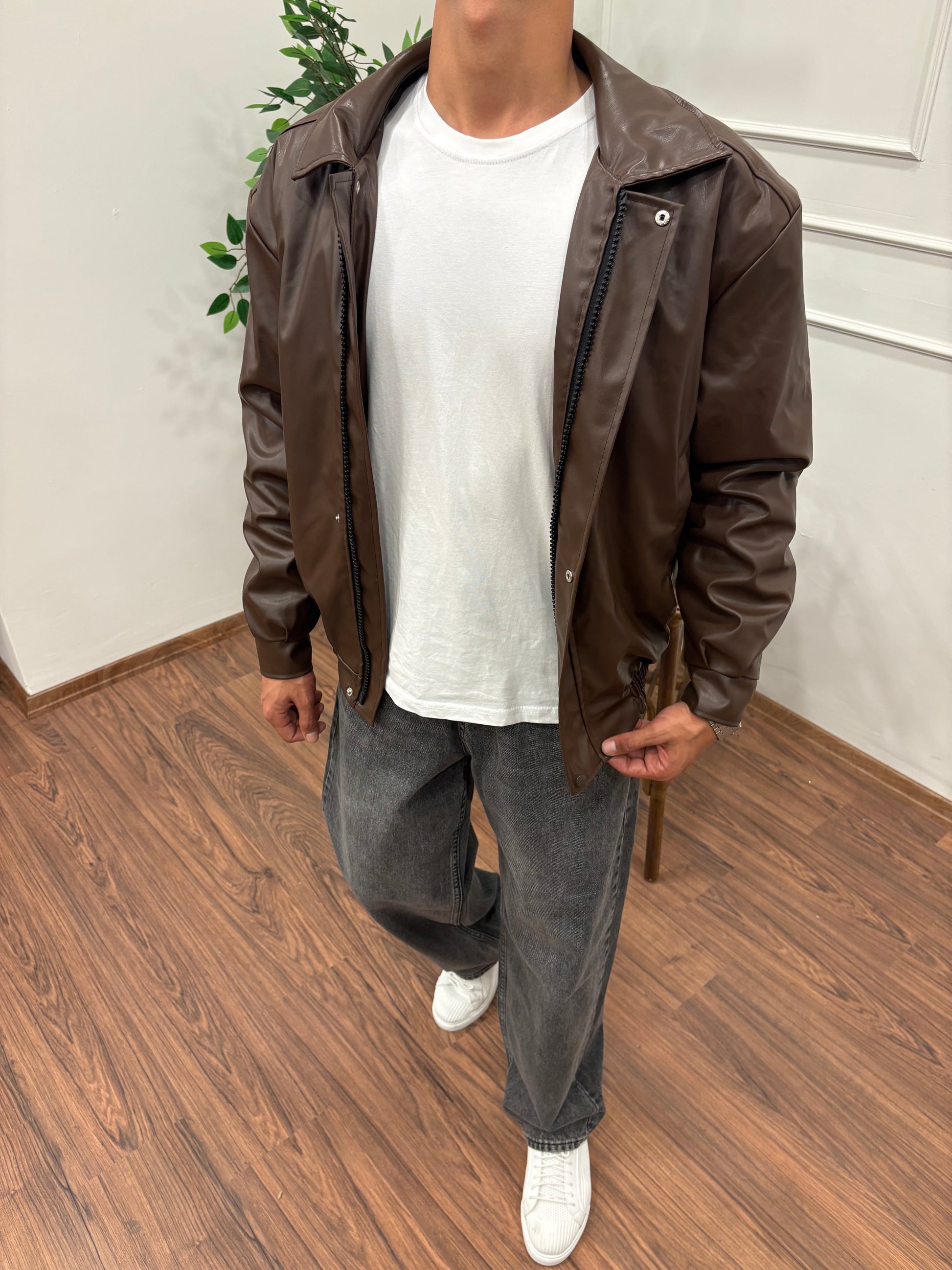 Tarzın merkezinde minimal deri ceket.