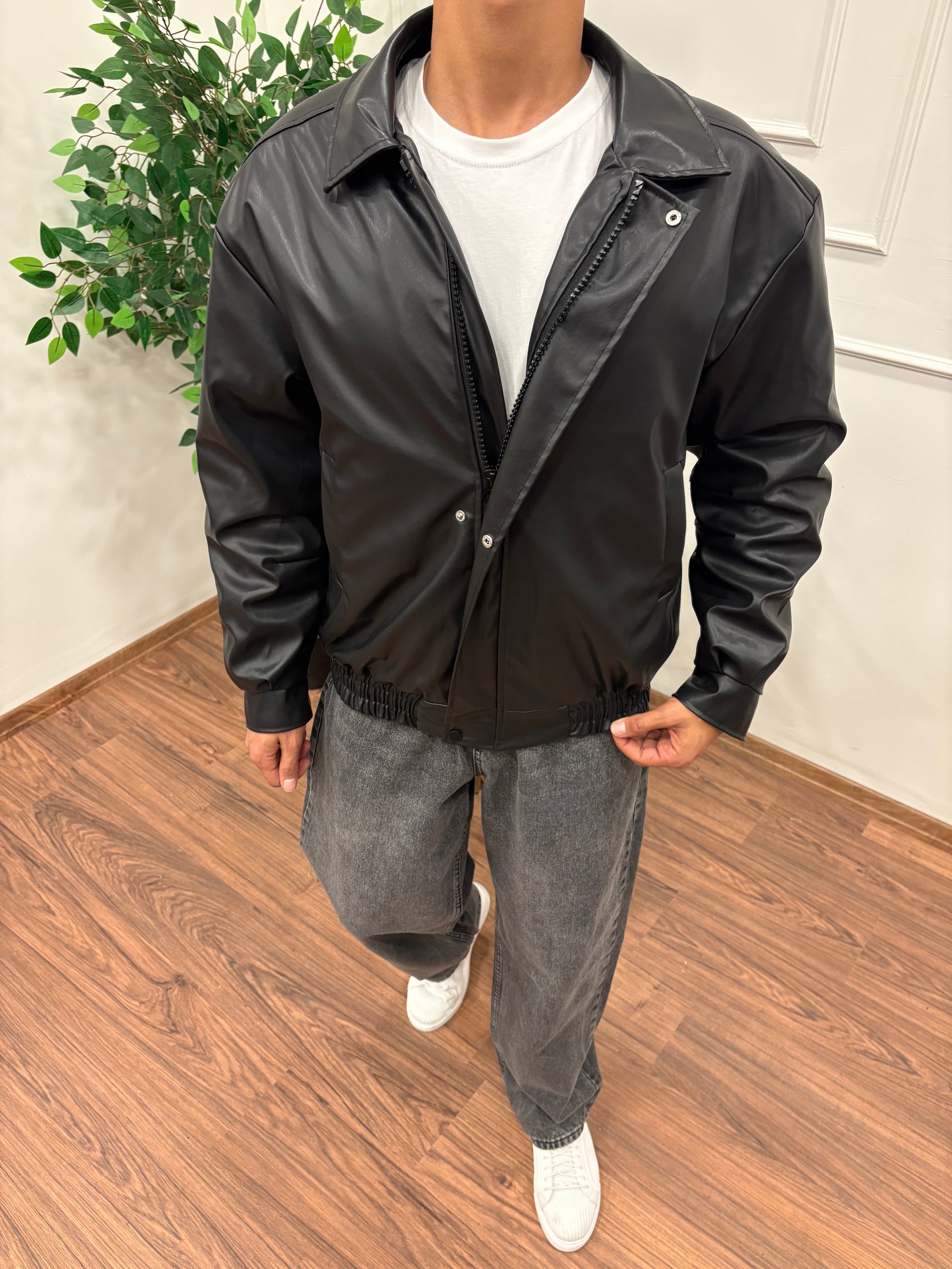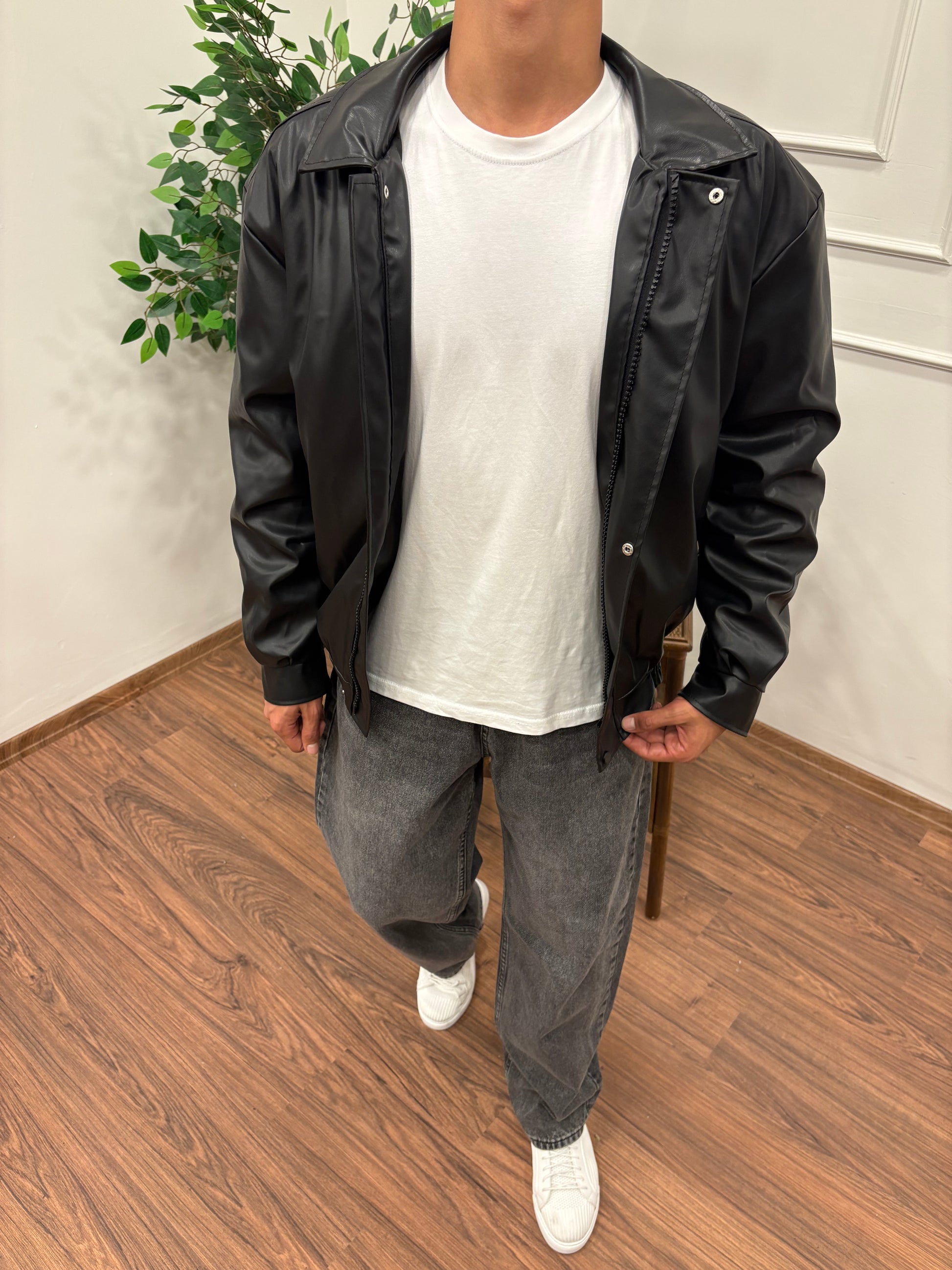 Tarzın merkezinde minimal deri ceket.