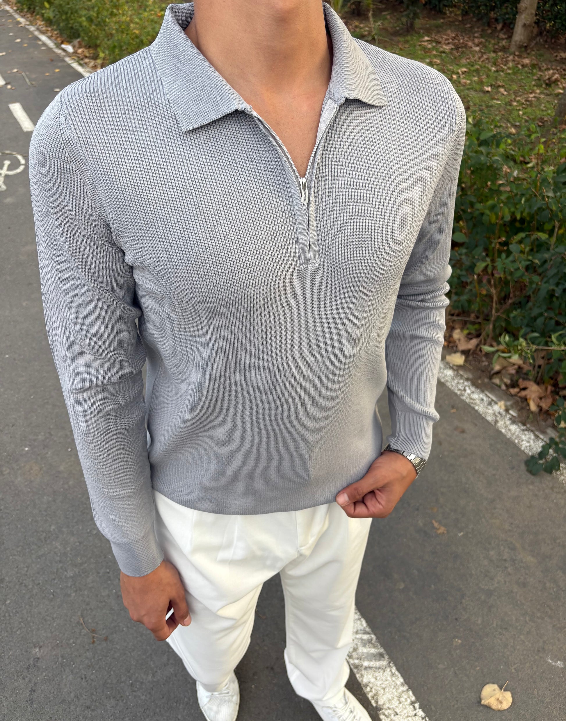 ÇELİK ÖRME YARIM FERMUARLI POLO YAKA SWEATSHİRT GRİ