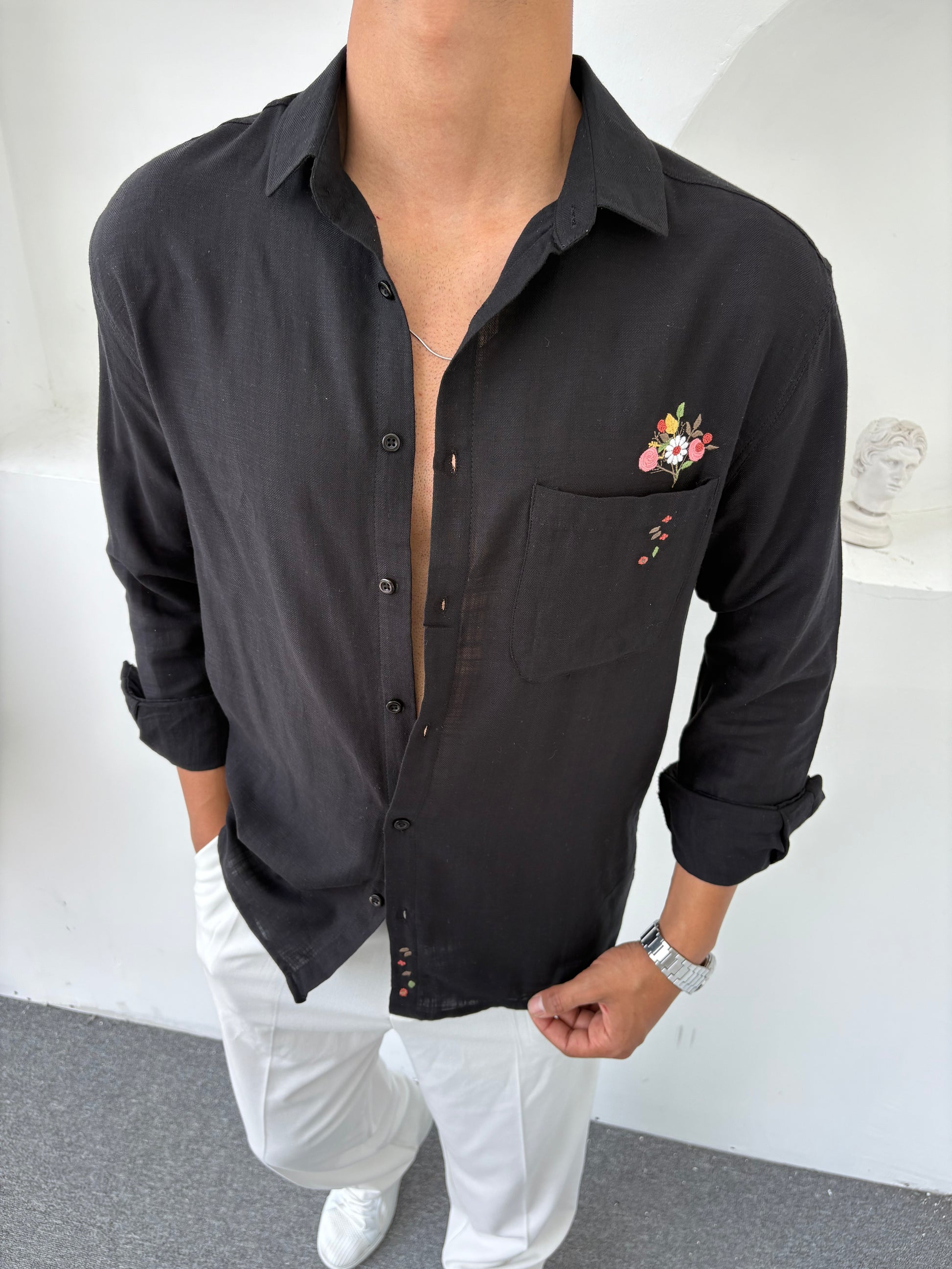 ÇEPLI NAKIŞ DETAYLI OVERSİZE MÜSLIM GÖMLEK SİYAH
