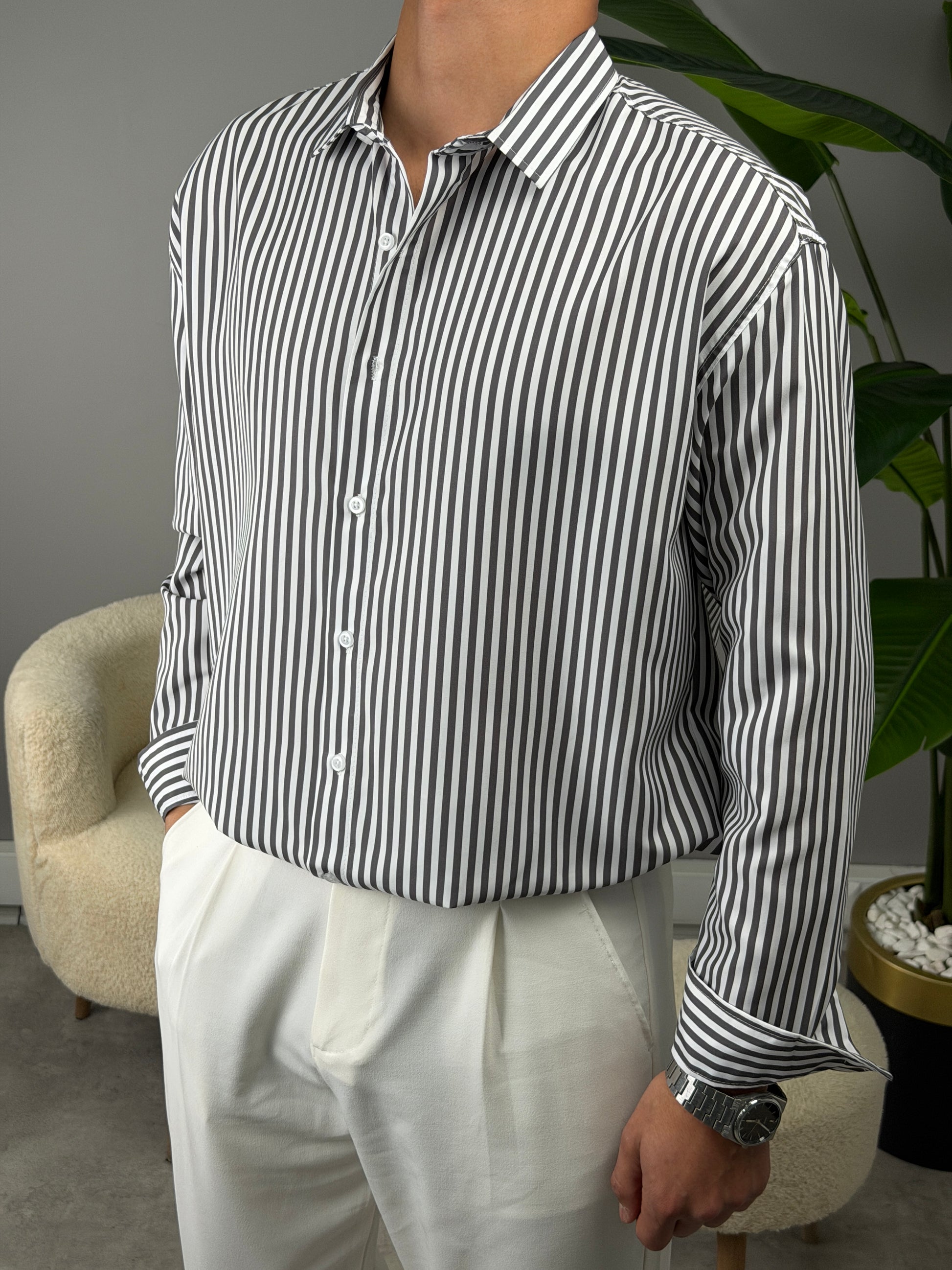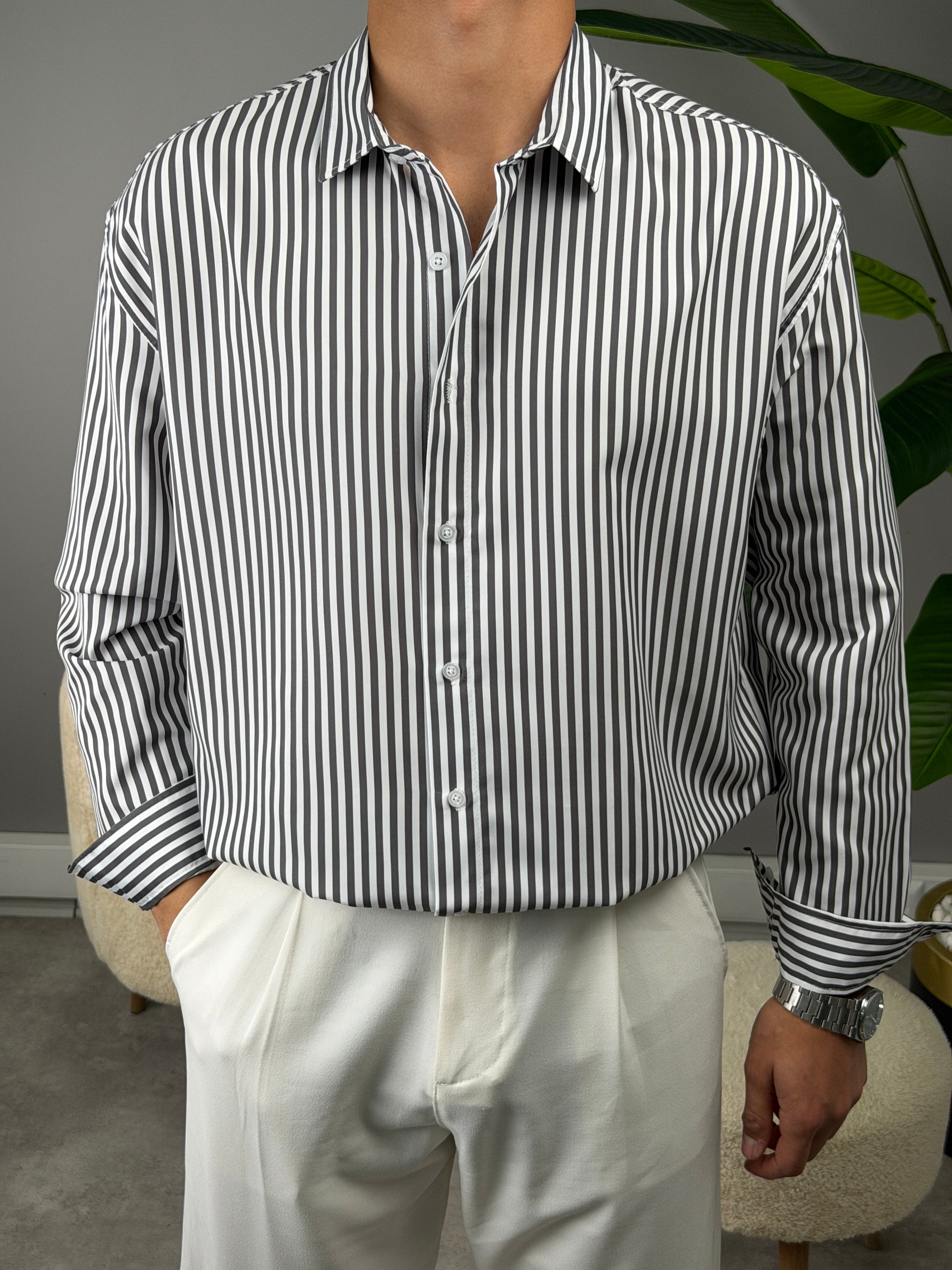 ÇİZGİLİ KETEN GÖMLEK ANTRASİT