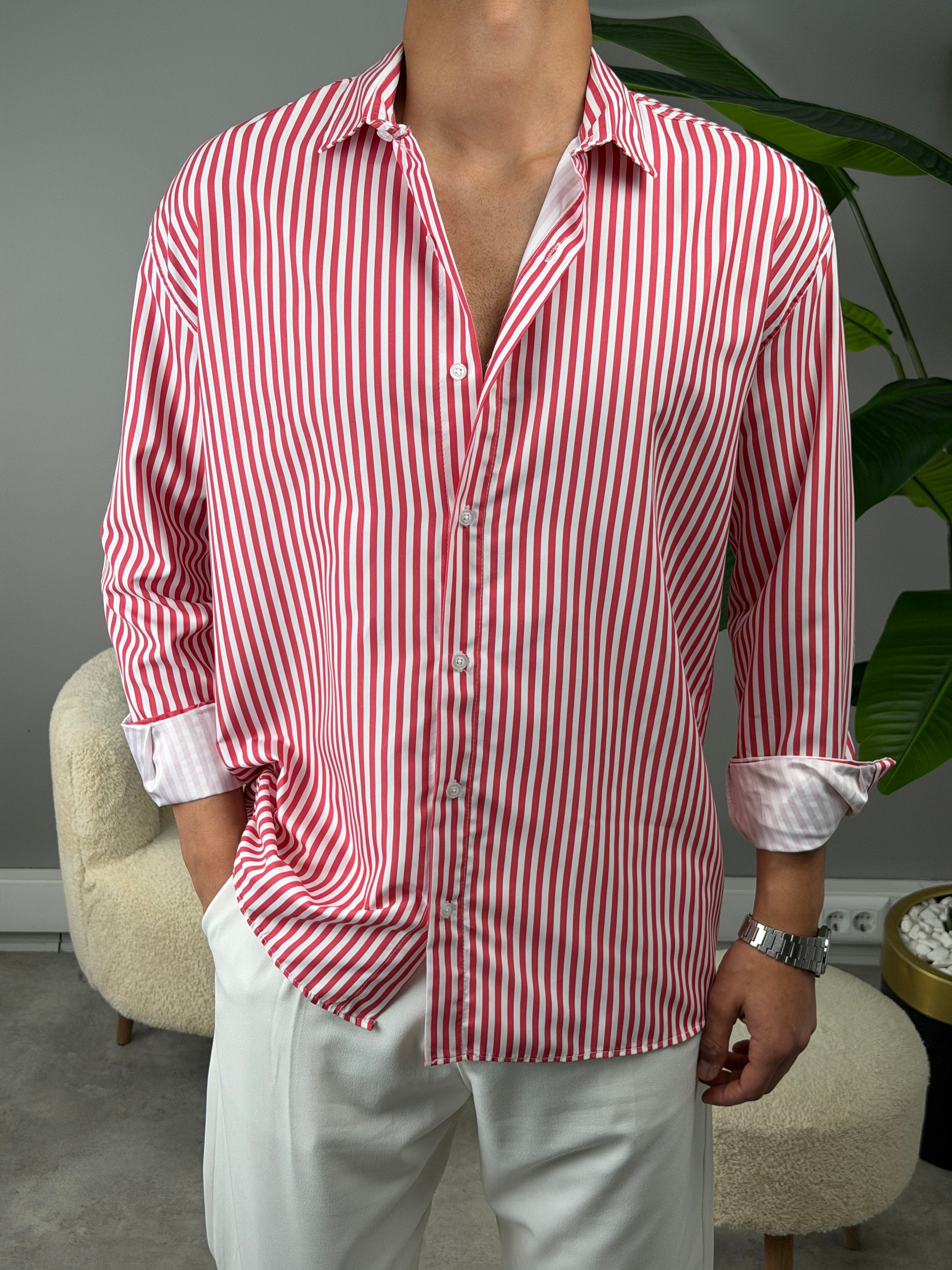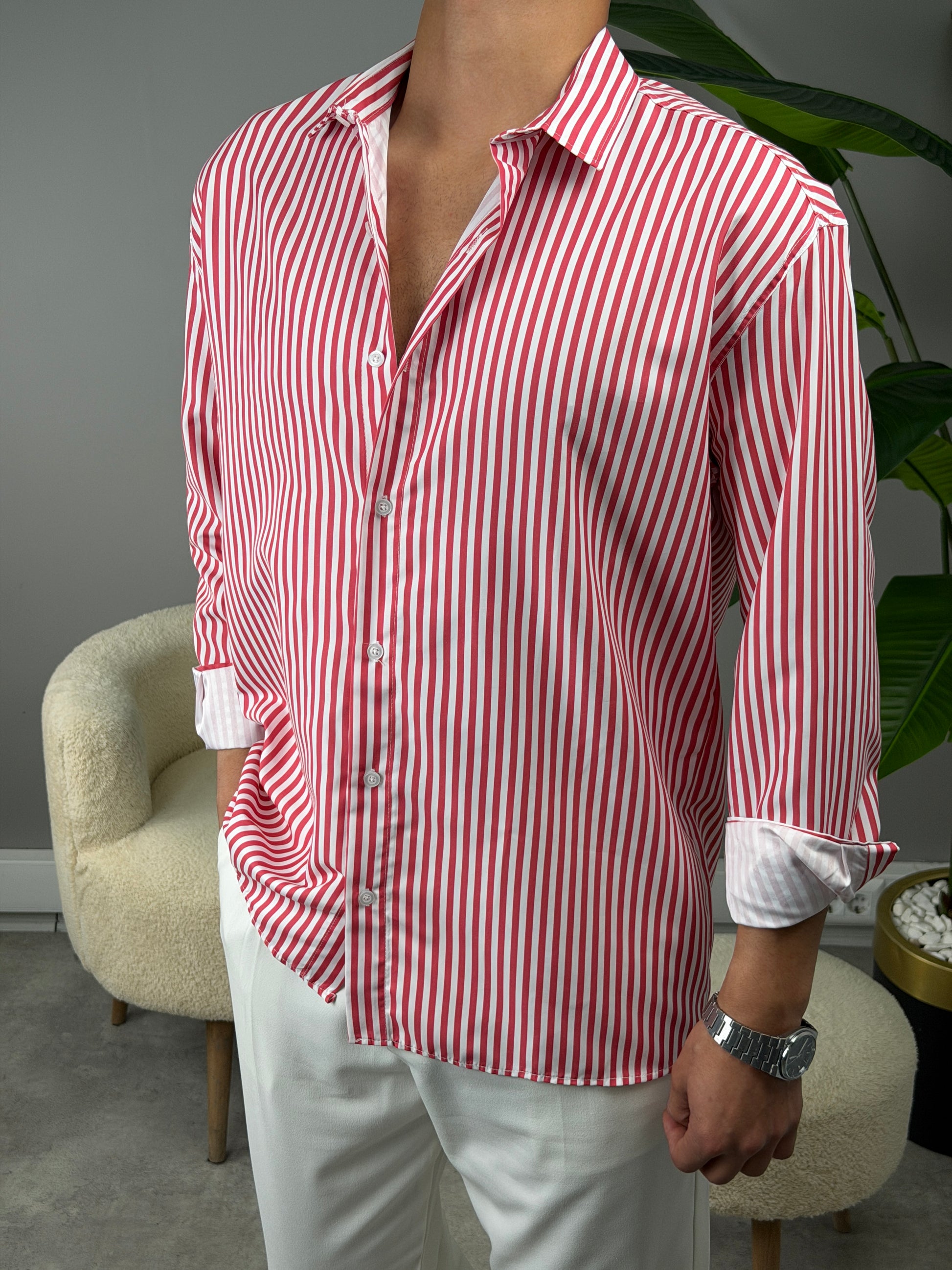 ÇİZGİLİ KETEN GÖMLEK BORDO