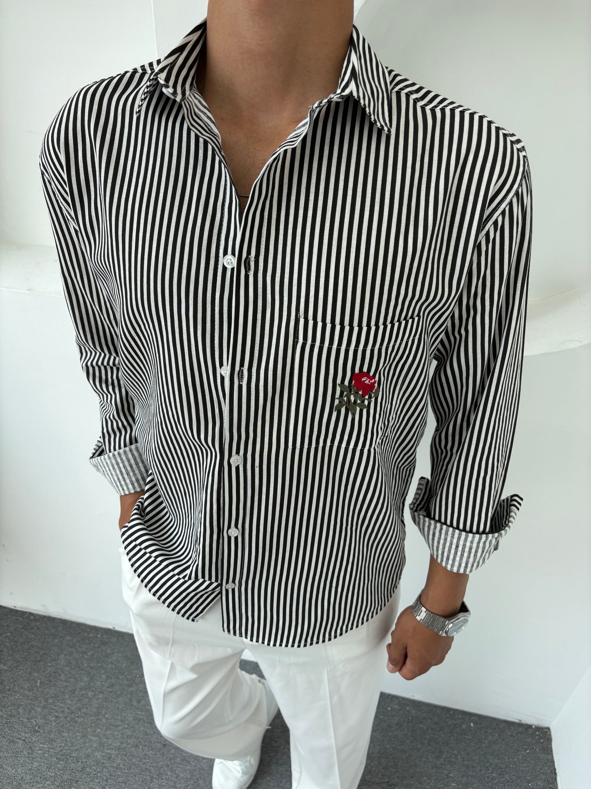 GÜL NAKIŞLI ÇİZGİLİ KETEN GÖMLEK SİYAH