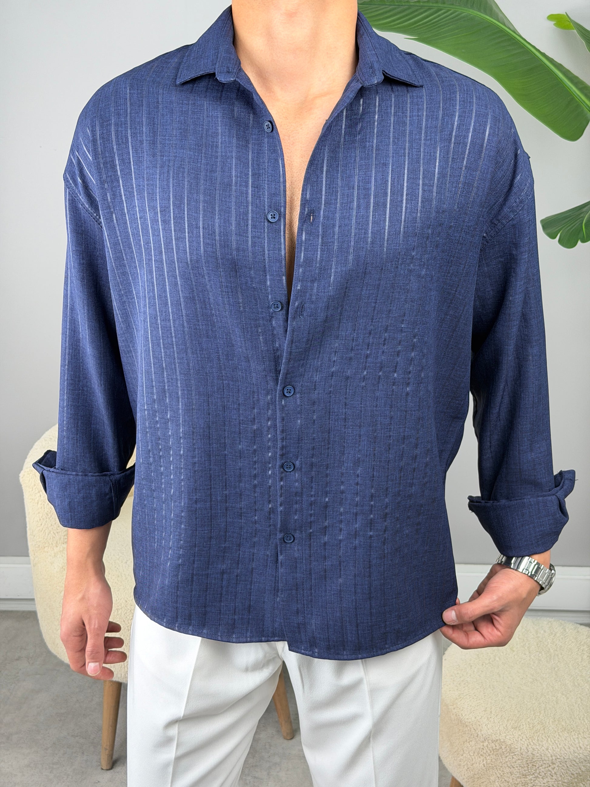 İNCE FİTİL DETAYLI KETEN GÖMLEK LACİVERT