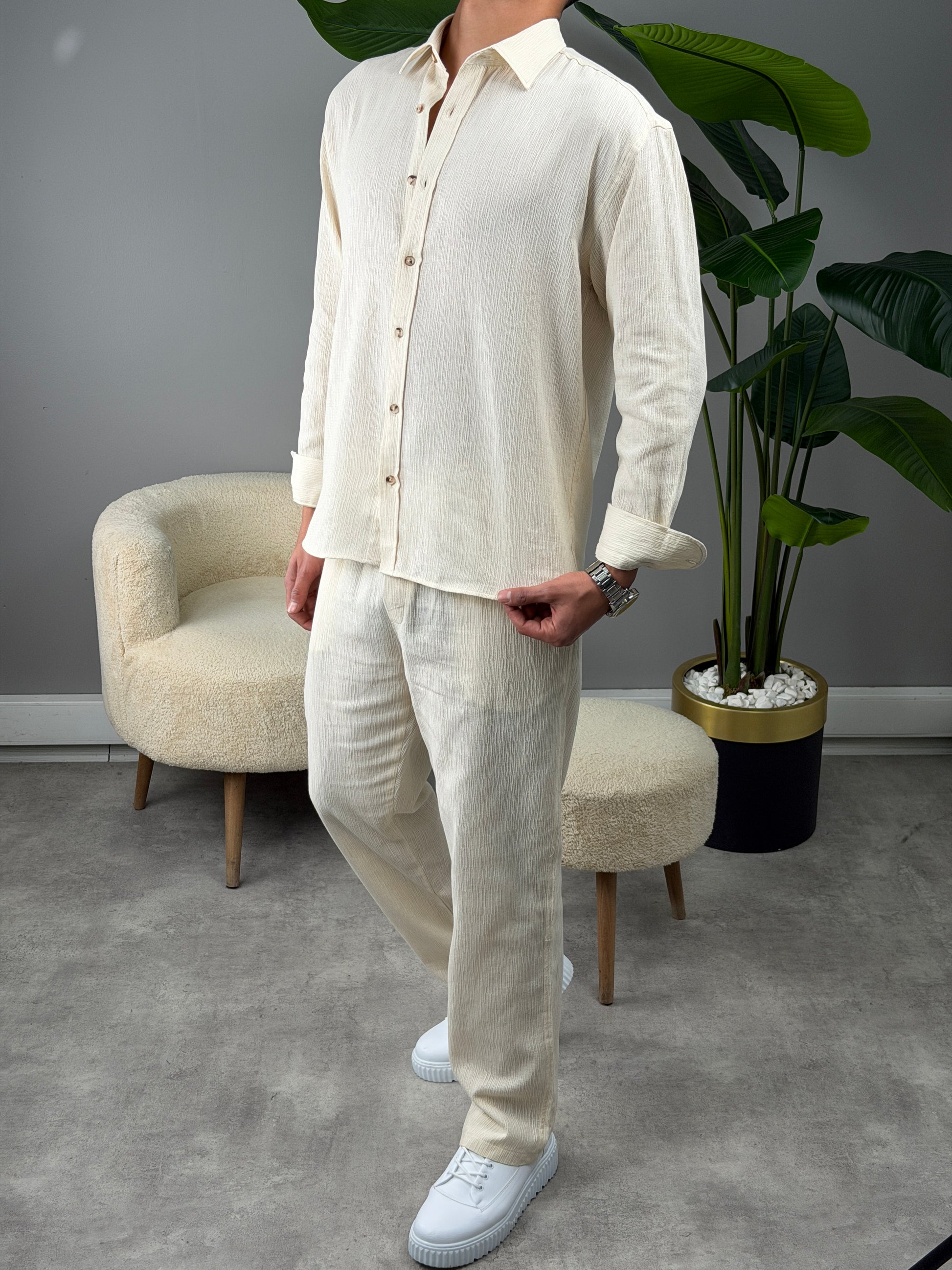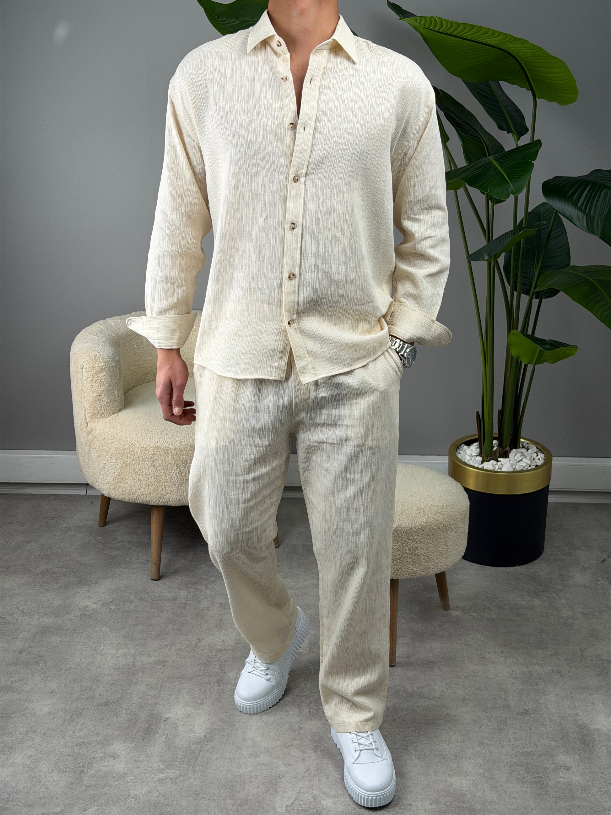 OVERSİZE HAM KETEN GÖMLEKLİ TAKIM BEJ