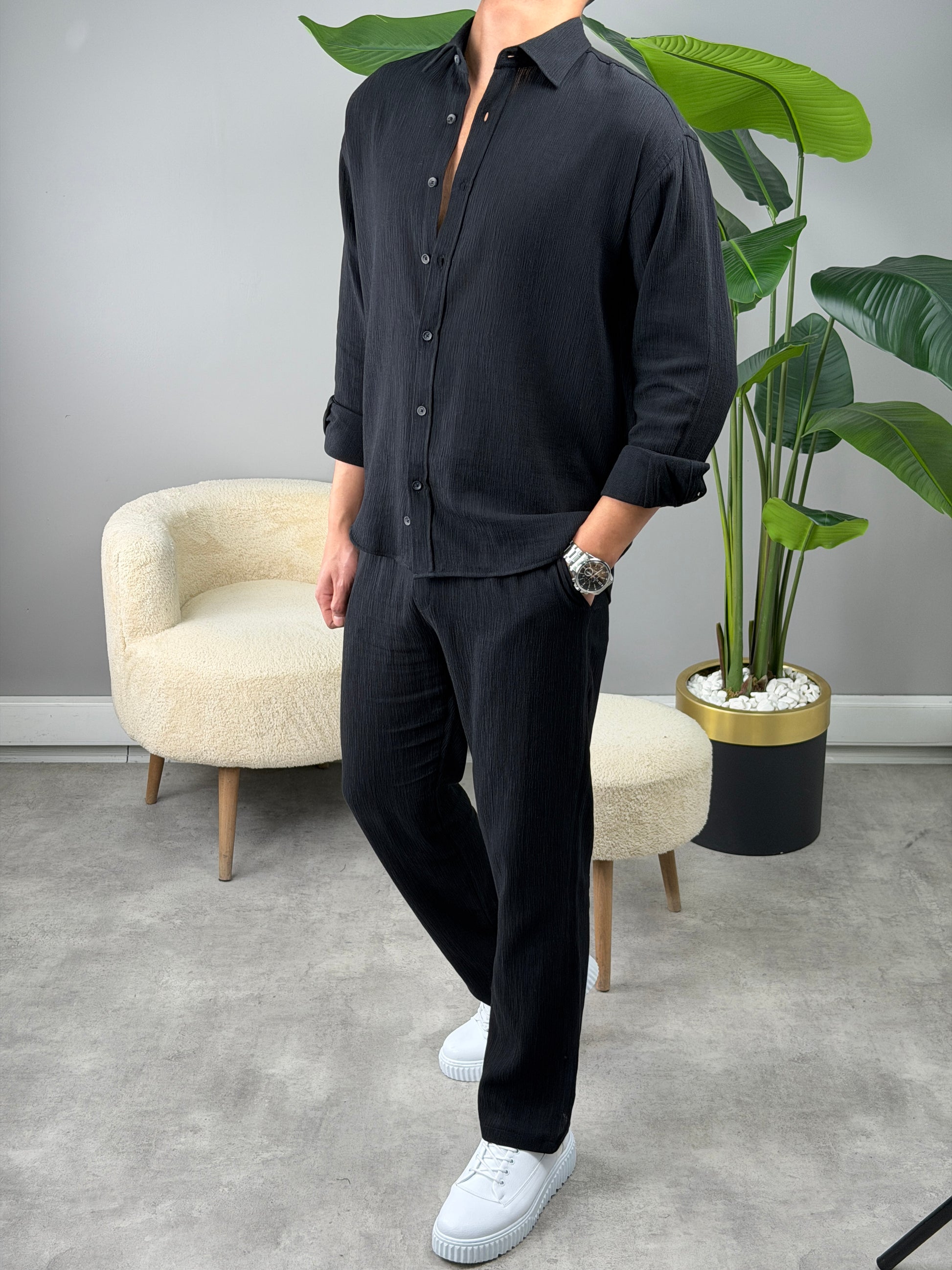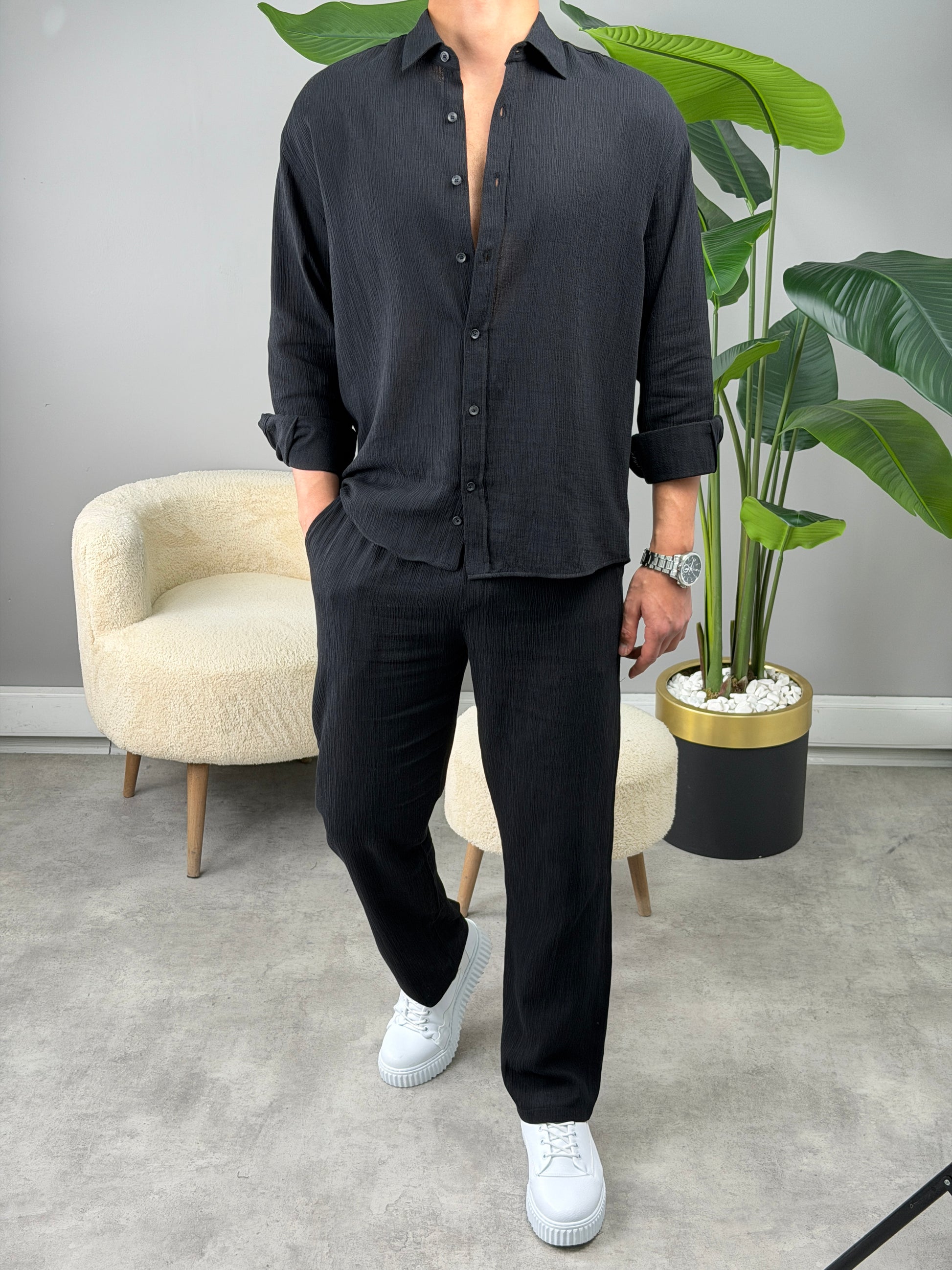 OVERSİZE HAM KETEN GÖMLEKLİ TAKIM SİYAH