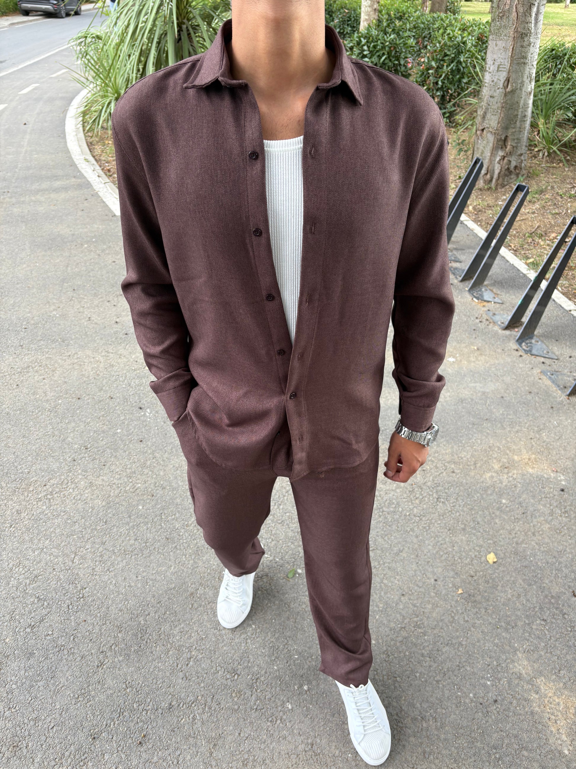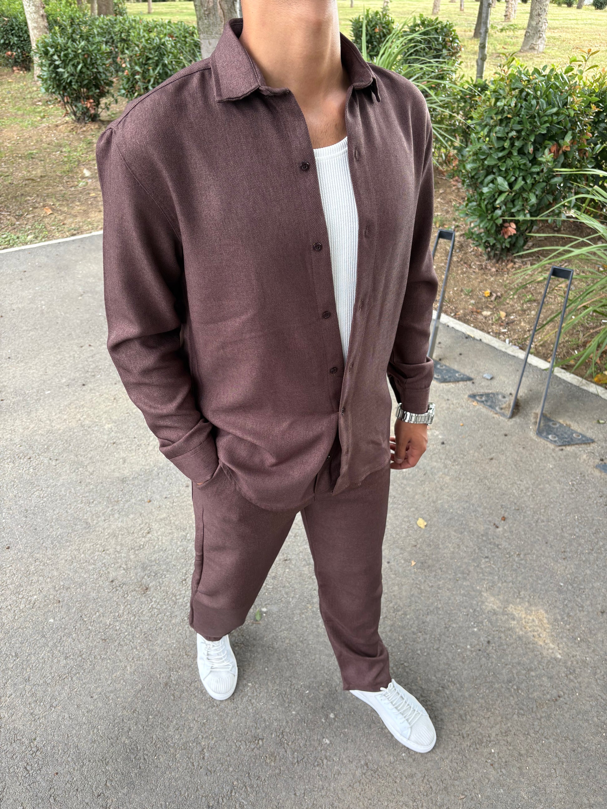 PAMUK ÖRME GÖMLEKLİ TAKIM KAHVE