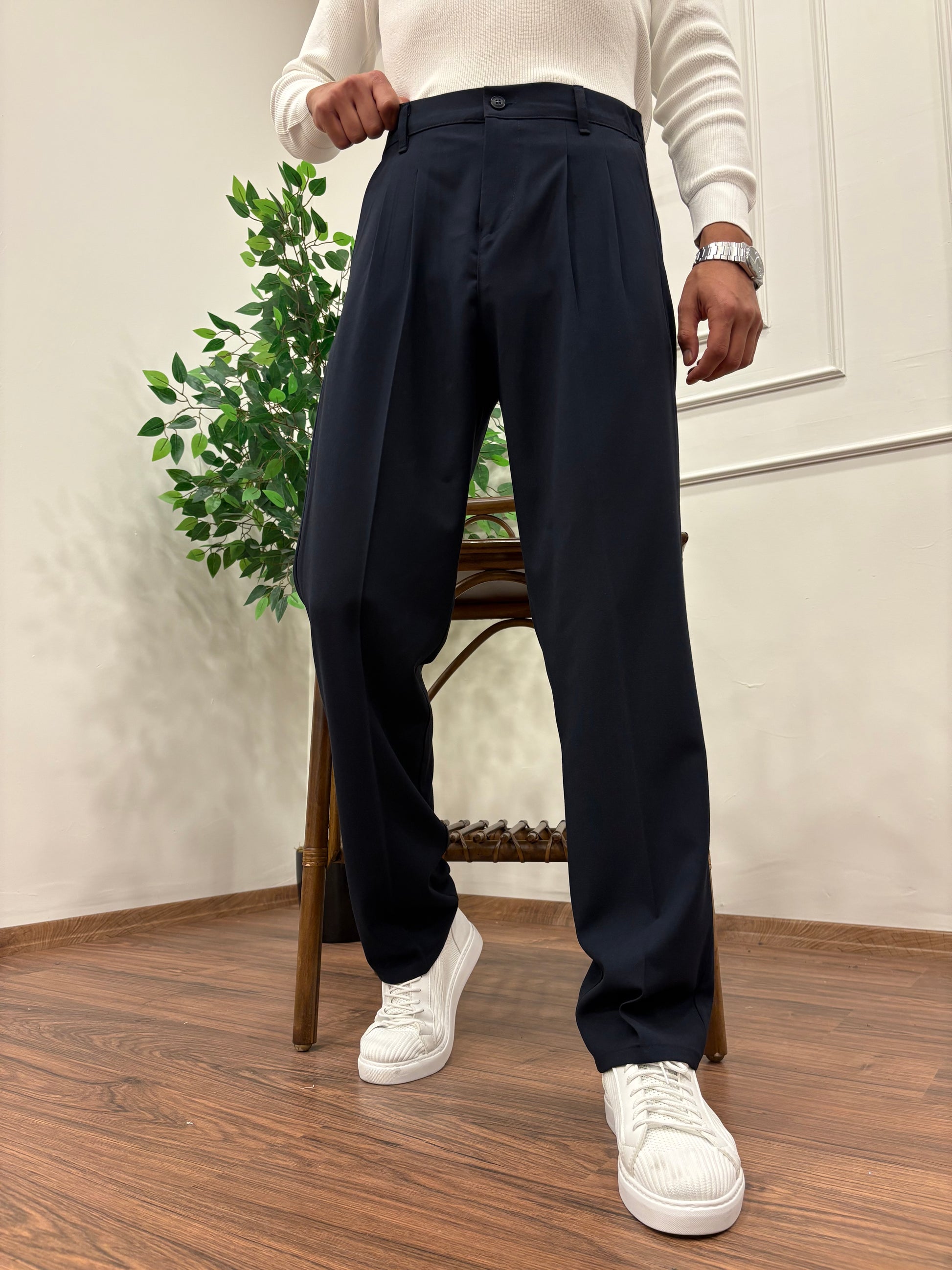 PİLELİ BAGGY KALIP KUMAŞ PANTOLON LACİVERT