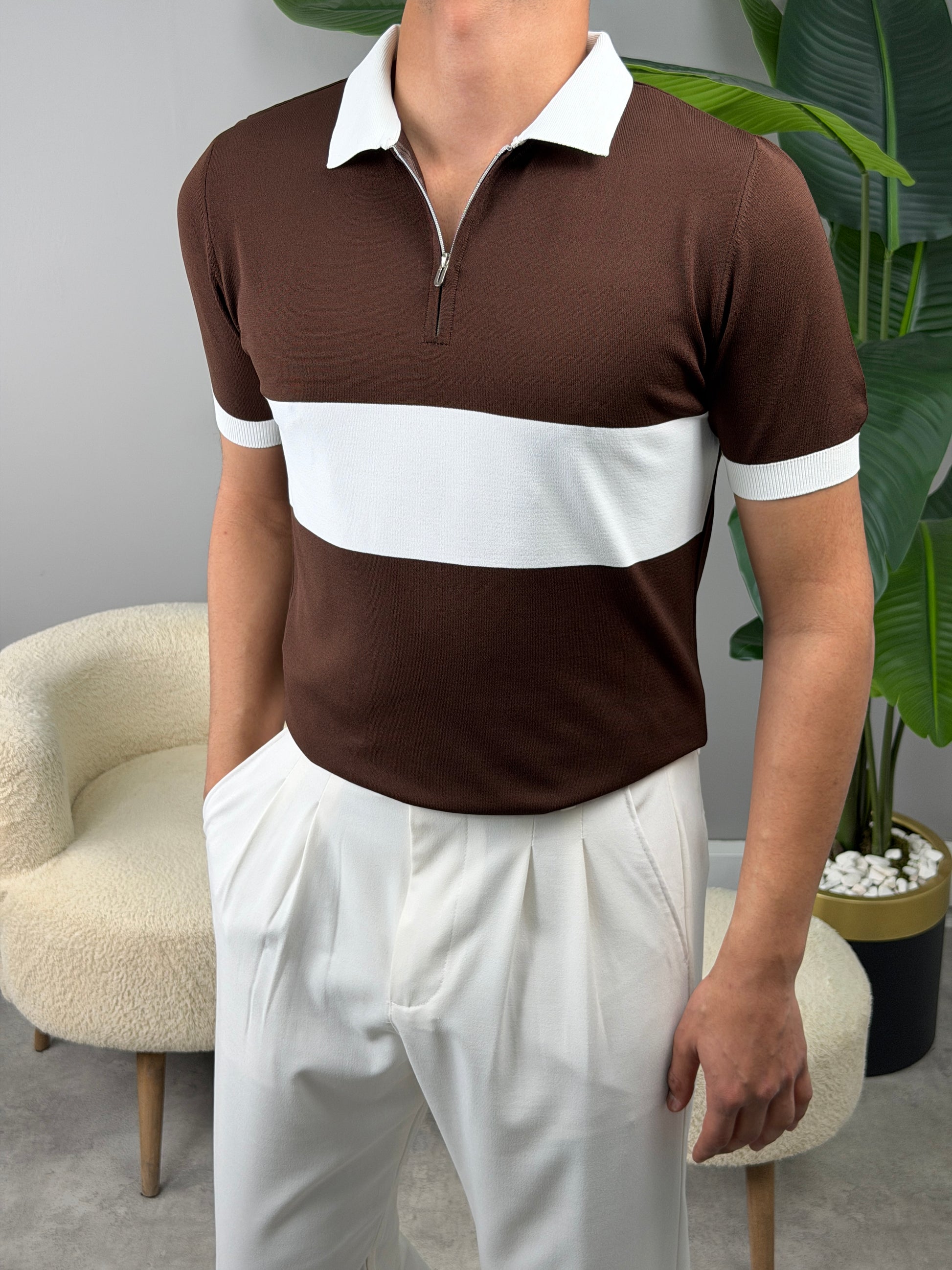 ŞERİTLİ YARIM FERMAUR POLO YAKA TSHİRT KAHVE