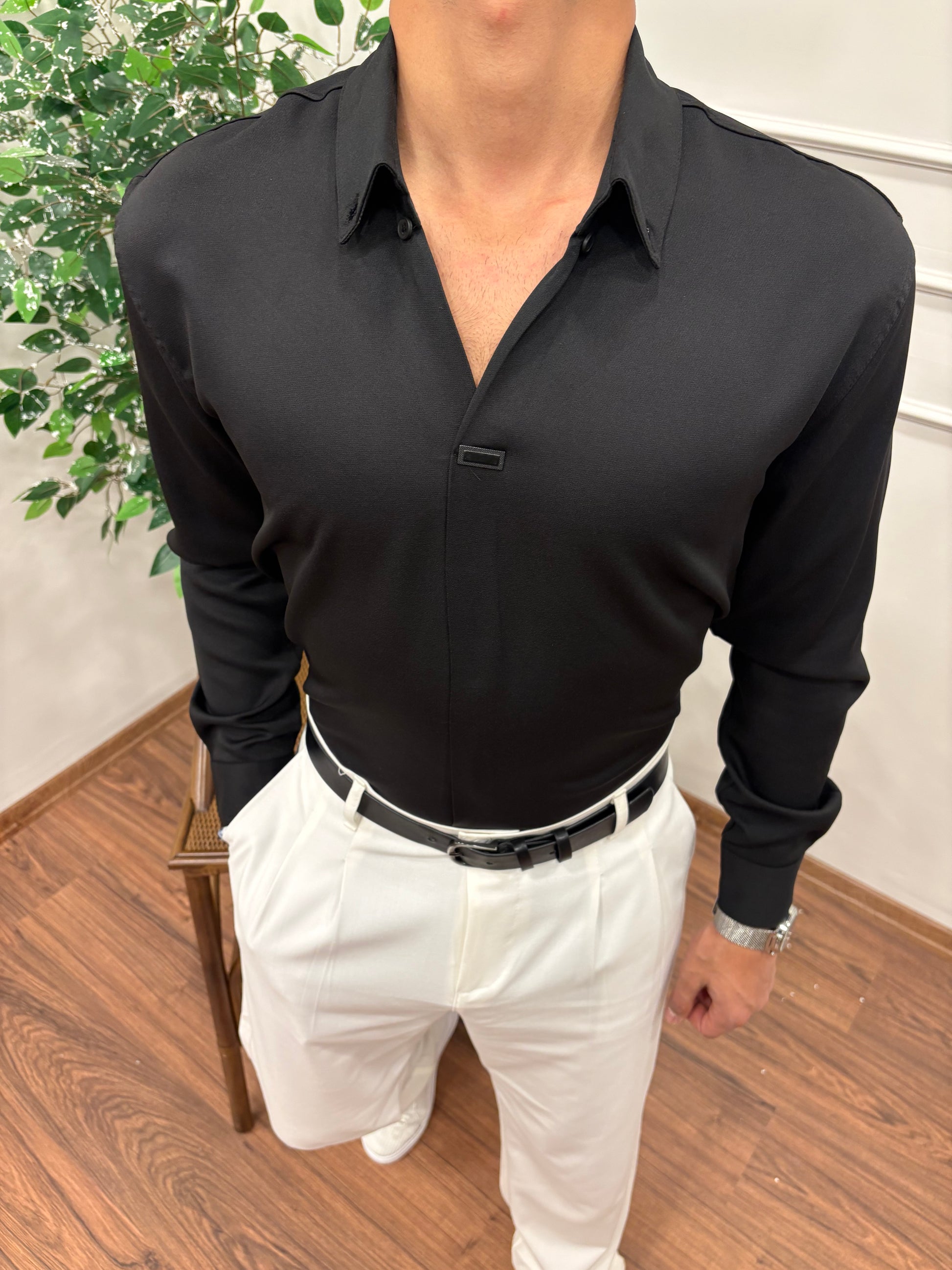 V YAKA DABIL KUMAŞ GÖMLEK SİYAH