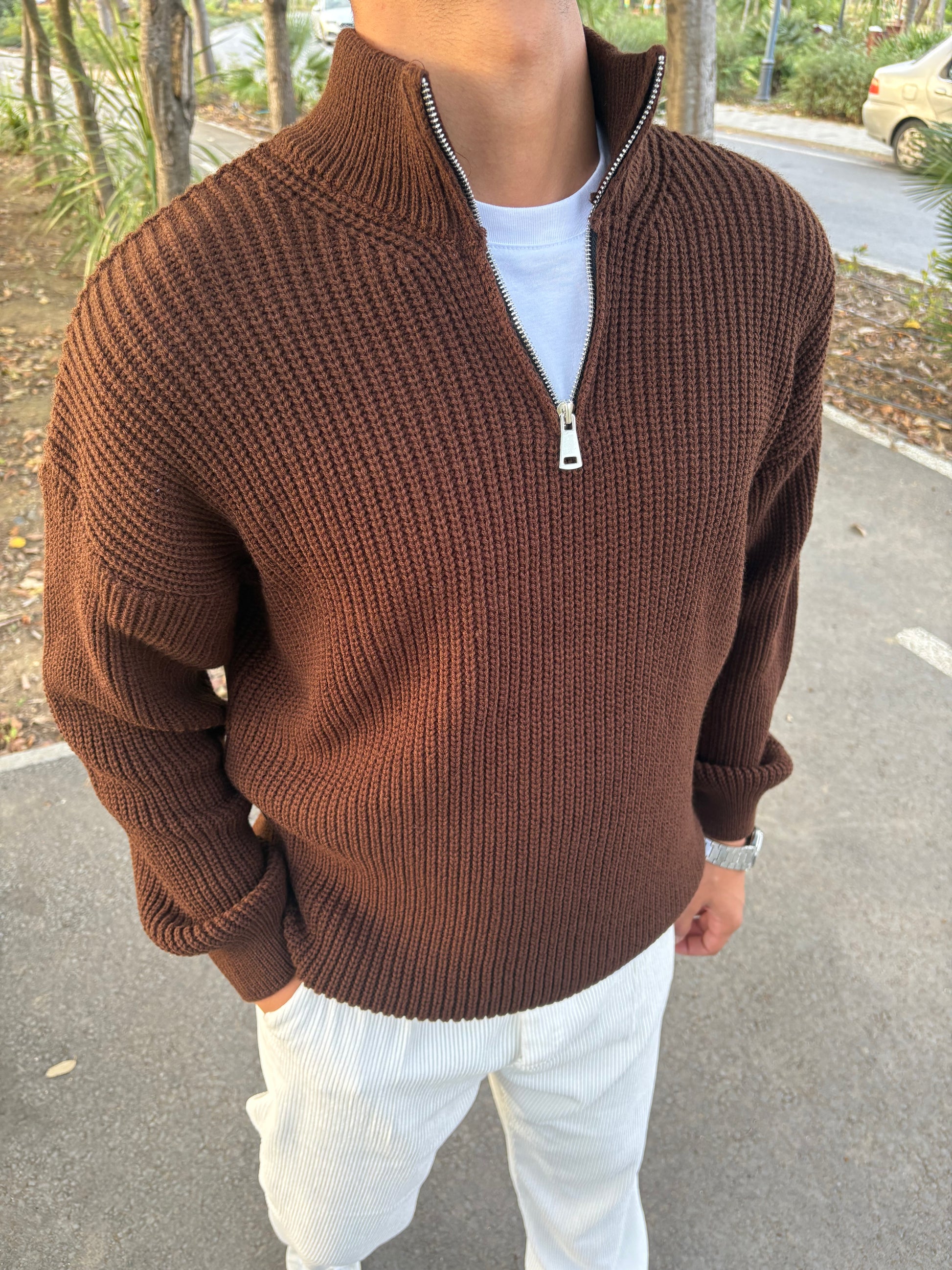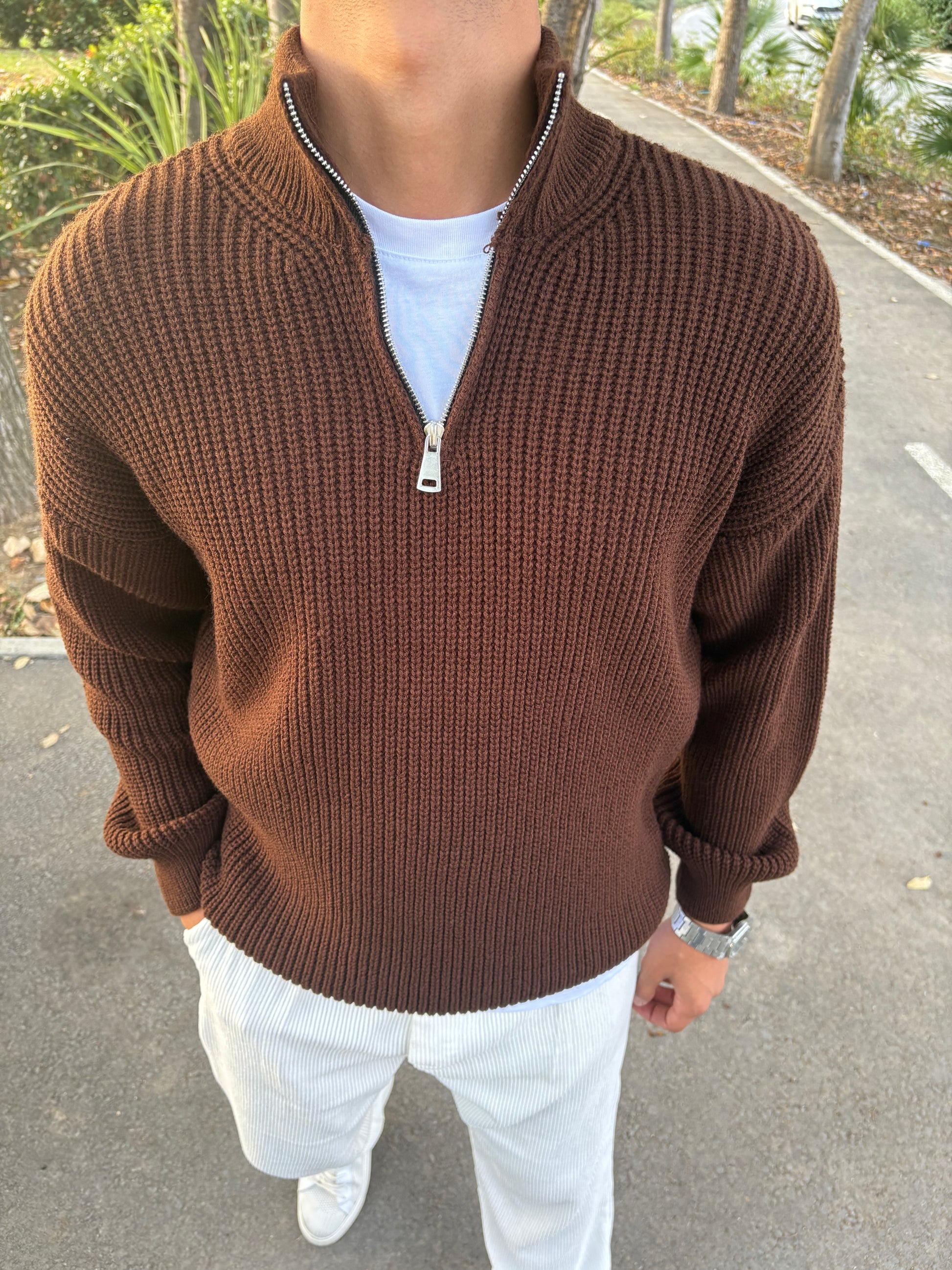 YARIM FERMAUAR TRİKO SWEATSHİRT ACI KAHVE